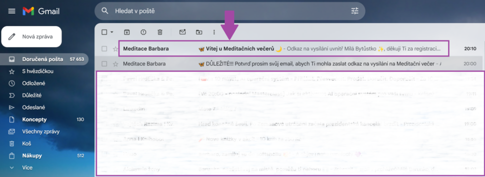 V e-mailu s předmětem "🦋 Meditační večer 🌙" najdeš odkaz na vysílání.