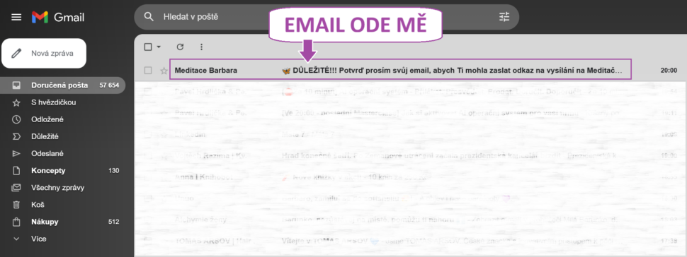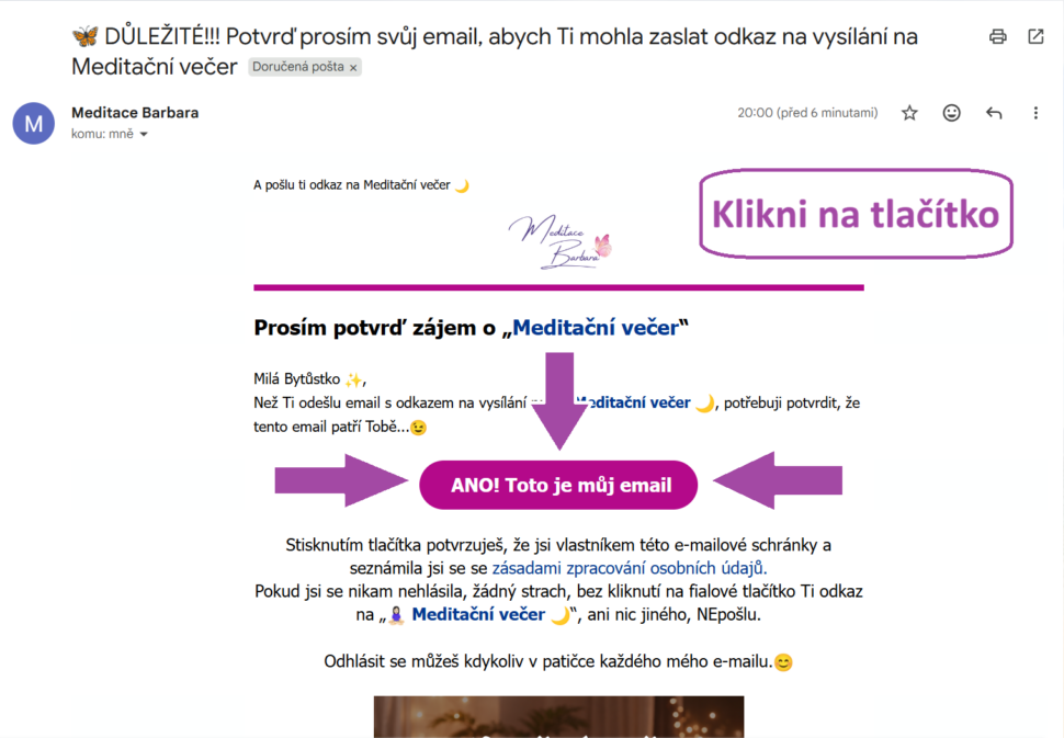 s předmětem "DŮLEŽITÉ!!! Potvrď prosím svůj e-mail, abych Ti mohla zaslat odkaz na meditační večer".